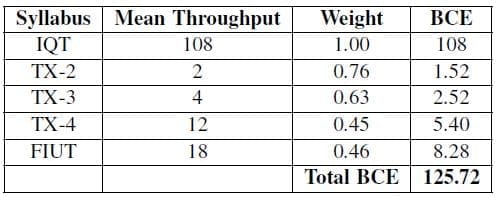 Basic crew equivalence (BCE) is a measure used by the 9 ATKS to capture annual crew production. The 9 ATKS is expected to produce at least 120 BCE per year under normal operations. The BCE factor is weighted by syllabus type, with the IQT syllbus being the most heavily weighted. The BCE weight for crew completion, by syllabus, is seen in Table 2.