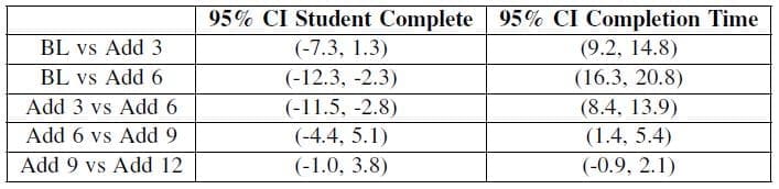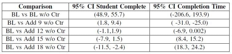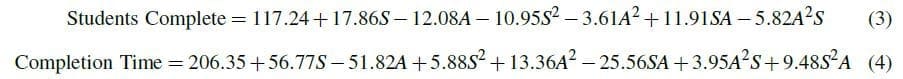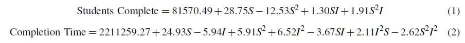 Second order models measuring effects on student throughput and completion time were analyzed. Equations (3) and (4) provide the reduced response surfaces in coded space for throughput and completion time, respectively.