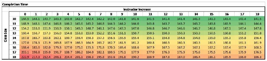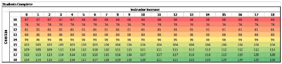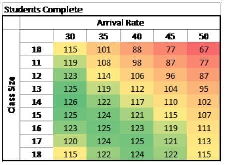 Heat maps were created with a range of possible combinations for each prediction equation. Figure 2 illustrates that shortest completion times are achieved when class sizes are smaller and more instructors are added. Student throughput is maximized when the class sizes are largest, but are not drastically impacted by increases in instructors, as depicted in Figure (3).