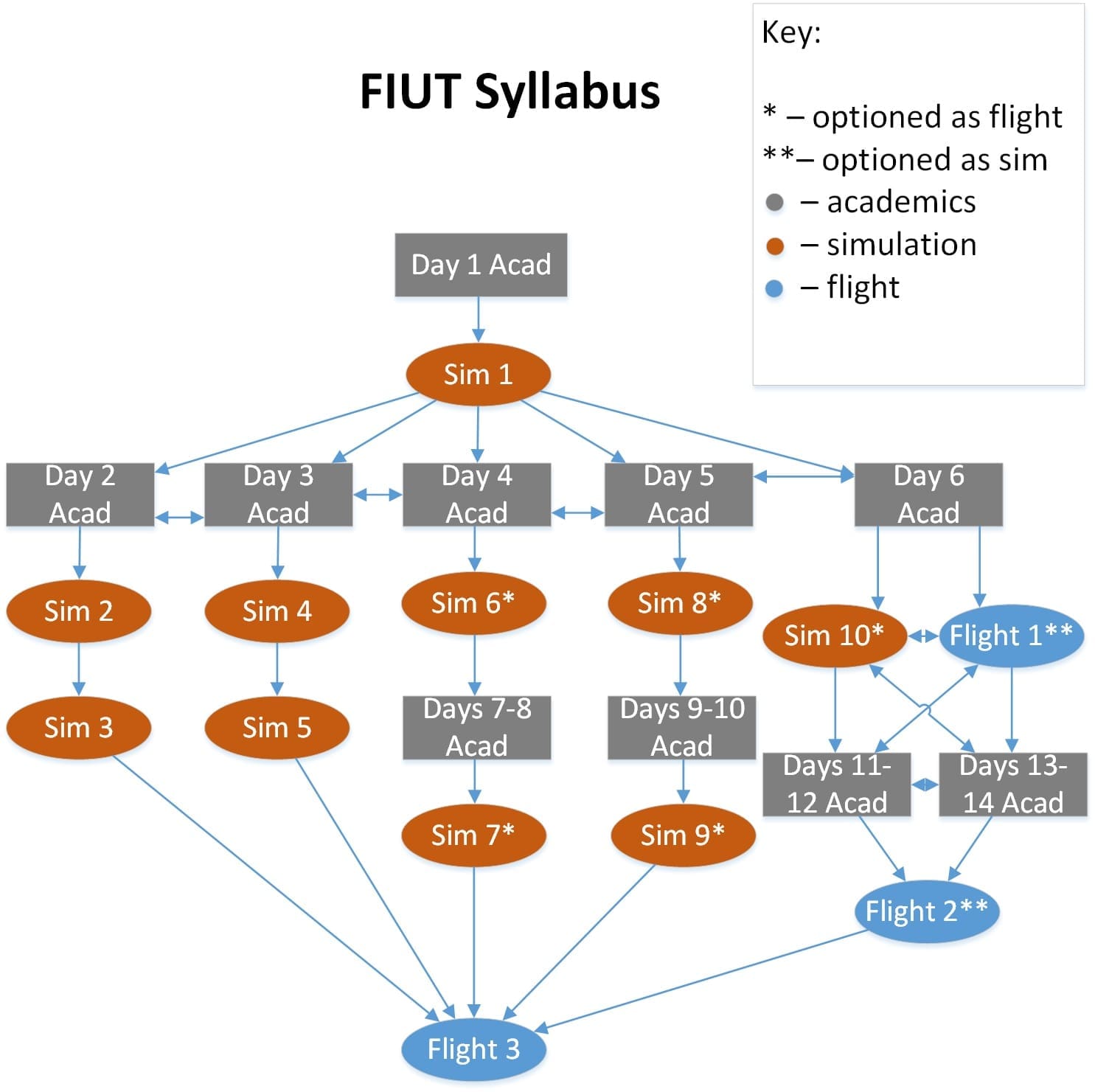 The FIUT course is used to train students to become instructors of the other four courses taught. All of the flights required for the course are reliant on the IQT syllabus flow, as the FIUT students instruct the IQT students as part of their course requirements. This aspect of the FIUT training was not modeled due to the complexity of the real-world training situation. The delays experienced due to this reliance have been built into the FIUT course task table to represent the time delay.