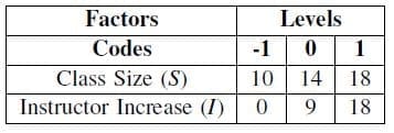 The range of class sizes for consideration was based upon historical data and anticipated future class size. The range for instructor manning was based upon the allowable manning levels authorized, and ranged from none to an increase of 18 to both pilots and sensor operators. The levels selected for each factor are listed below in Table 8. A central composite design with axial points on the face and an additional center point was used to analyze the different levels of instructor and student class size.