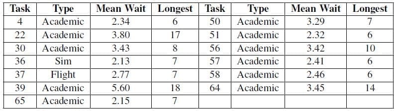 Student wait times for each task were also collected. Of the 72 tasks in the IQT syllabus, 33 had a mean wait time exceeding one day, with 19 being academic courses requiring the entire class to complete together. Task 39 has the longest mean wait time and follows a series of seven flights, of which two have the 2509 highest failure rate in the syllabus. A majority of training delays occur for academic courses requiring the class to complete simultaneously, with academic courses accounting for 55.1% of the waits experienced, while flights in aircraft and simulators comprised 24.2% and 20.7% of the wait time, respectively. Table 5 provides the mean and longest observed wait for tasks exceeding a mean wait of two days.