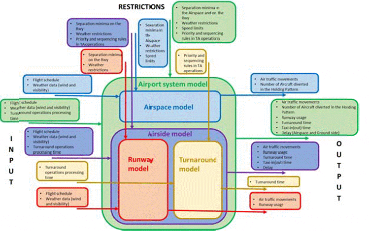 In order to perform a deep analysis of the future airport and make an efficient use of the resources, a methodological approach was followed. It is a divide-and-conquer approach of a model-based analysis for identifying the factors that affect the performance of the sub systems and then the independent models were overlaid for developing an integral one. We used stochastic models based on discrete event systems approach (DES) of SIMIO which is a tool that has the object-oriented characteristics that allowed a smooth implementation of the methodology. The developed model has is dynamic, stochastic, and asynchronous. It is composed by different sub models that represent the identified subsystems of the airport environment. This approach allows to assess the independent performance of the subsystems and after the coupling, new restrictions are imposed in the final model. The next figure illustrates the architecture of the different developed models.