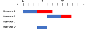 The resources in a resource model are defined by a state that can be busy, idle, or off-shift. When a resource is busy with one task or off-shift, other tasks must wait to be allocated to the resource (e.g. red waits for blue on resource A). The scheduling tools that are based on a resource model all share this same representation of the factory capacity and differ only in how tasks are assigned to the resources.